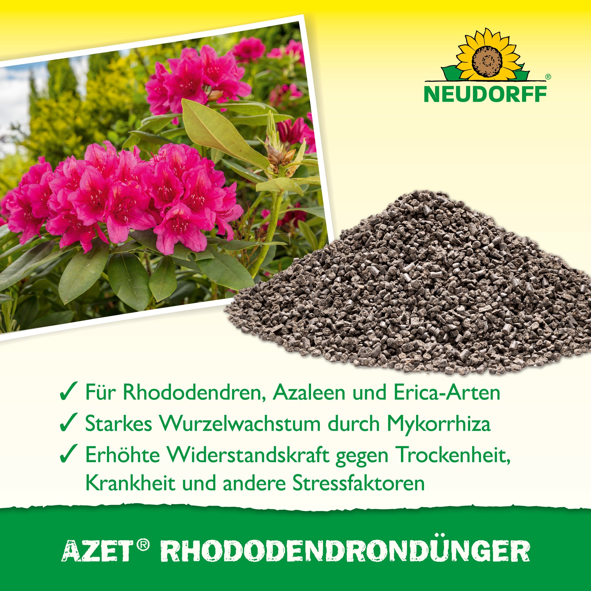 Der organische Azet RhododendronDünger hat einen NPK-Wert von 7-3-5 und versorgt Ihre Rhododendren, Azaleen und Erica-Arten im Moorbeet mit sofort verfügbaren Nährstoffen zur schnellen Versorgung der Pflanzen. Der Volldünger bietet zudem bis zu 3 Monaten eine zuverlässige Langzeitwirkung. Ihre Pflanzen wachsen gesund und bilden prächtige Blüten. Azet RhododendronDünger erhöht die Widerstandsfähigkeit gegen Trockenheit, Krankheit und Kälte im Winter.
