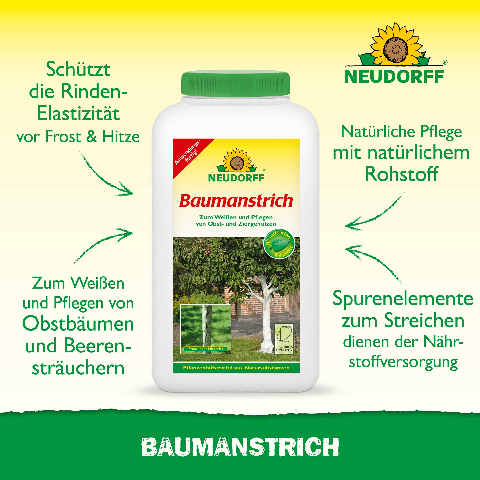 Baumanstrich pflegt die Rinde von Bäumen und Sträuchern, reflektiert das Sonnenlicht, bewahrt die natürliche Rinden-Elastizität im Sommer bei Hitze, sowie im Winter bei Frost. Zudem dient der Anstrich der Nährstoffversorgung. Die enthaltenen wertvollen Spurenelemente werden allmählich freigesetzt und von den Wurzeln aufgenommen. Streichen Sie Baumanstrich an frostfreien, trockenen Tagen unverdünnt auf den Stamm. Der Anstrich benötigt max. 24 Stunden zum Abbinden.