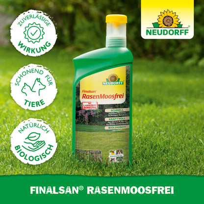 Finalsan RasenMoosfrei beseitigt schnell, dauerhaft und umweltverträglich Moos im Rasen. Auch bei niedrigen Temperaturen ist das Mittel gut wirksam. Der Wirkstoff ist eine Fettsäure, wie sie auch in der Natur vorkommt. Nach dem Auftrag stirbt das Moos innerhalb weniger Stunden ab und wird braun. Je nach Befallsstärke kann das Moos aus dem Rasen herausgeharkt und kompostiert, oder auch im Rasen belassen werden, bis es sich zersetzt. Behandelte Rasenflächen können nach Antrocknen von Finalsan RasenMoosfrei sofort, auch von Hunden und Katzen, wieder betreten werden. Finalsan RasenMoosfrei ist nicht geeignet gegen Unkräuter im Rasen. Finalsan RasenMoosfrei ist biologisch abbaubar (nach OECD 301 F) und nicht NB 6641: Nicht bienengefährlich (B4).