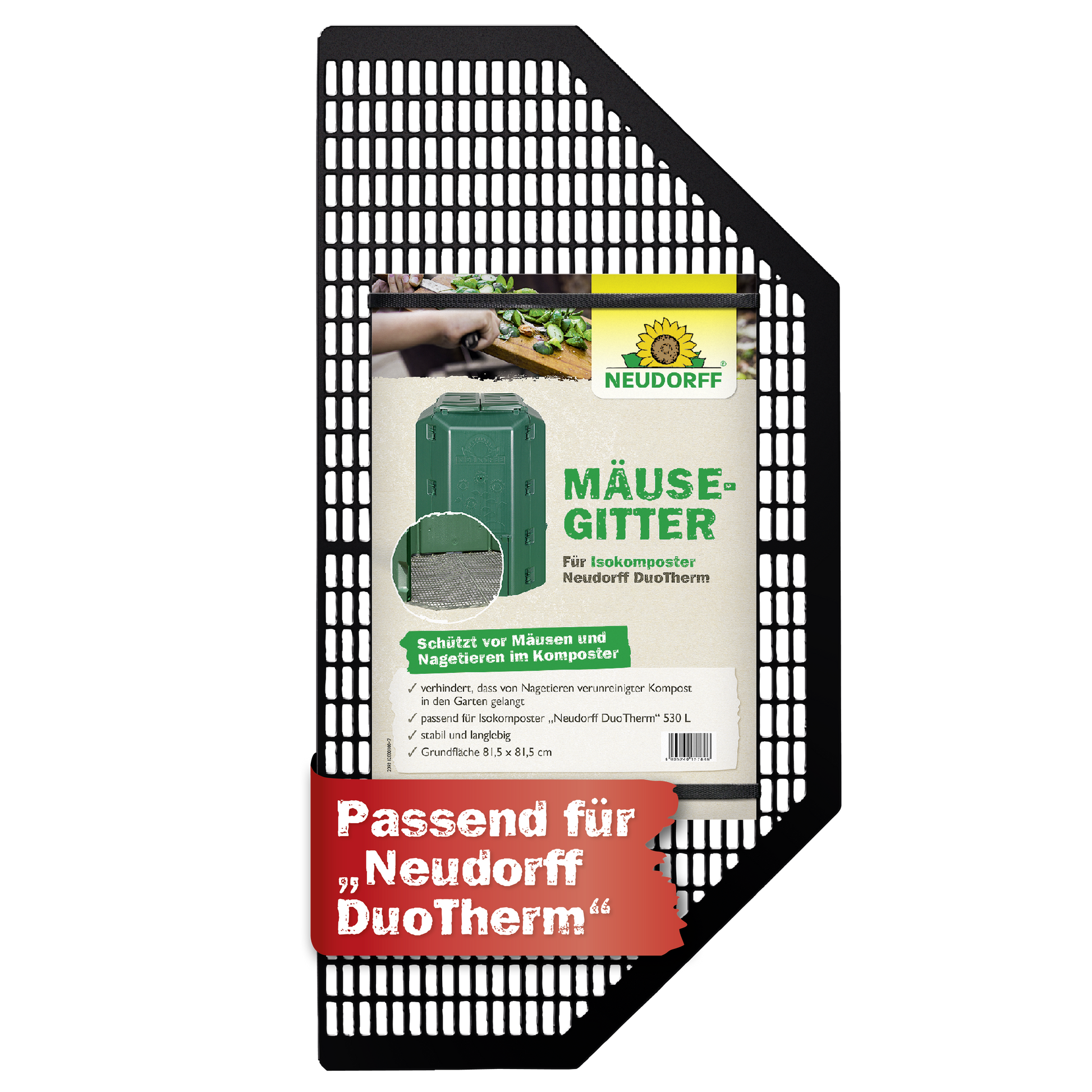 Das Mäusegitter aus stabilem, langlebigen Kunststoff verhindert, dass Nagetiere aus dem Erdreich in das Kompostgut gelangen und es verunreinigen. Das Bodengitter passt mit den Maßen 81,5 cm x 81,5 cm perfekt für den Thermokomposter „Neudorff DuoTherm“ 530 L.