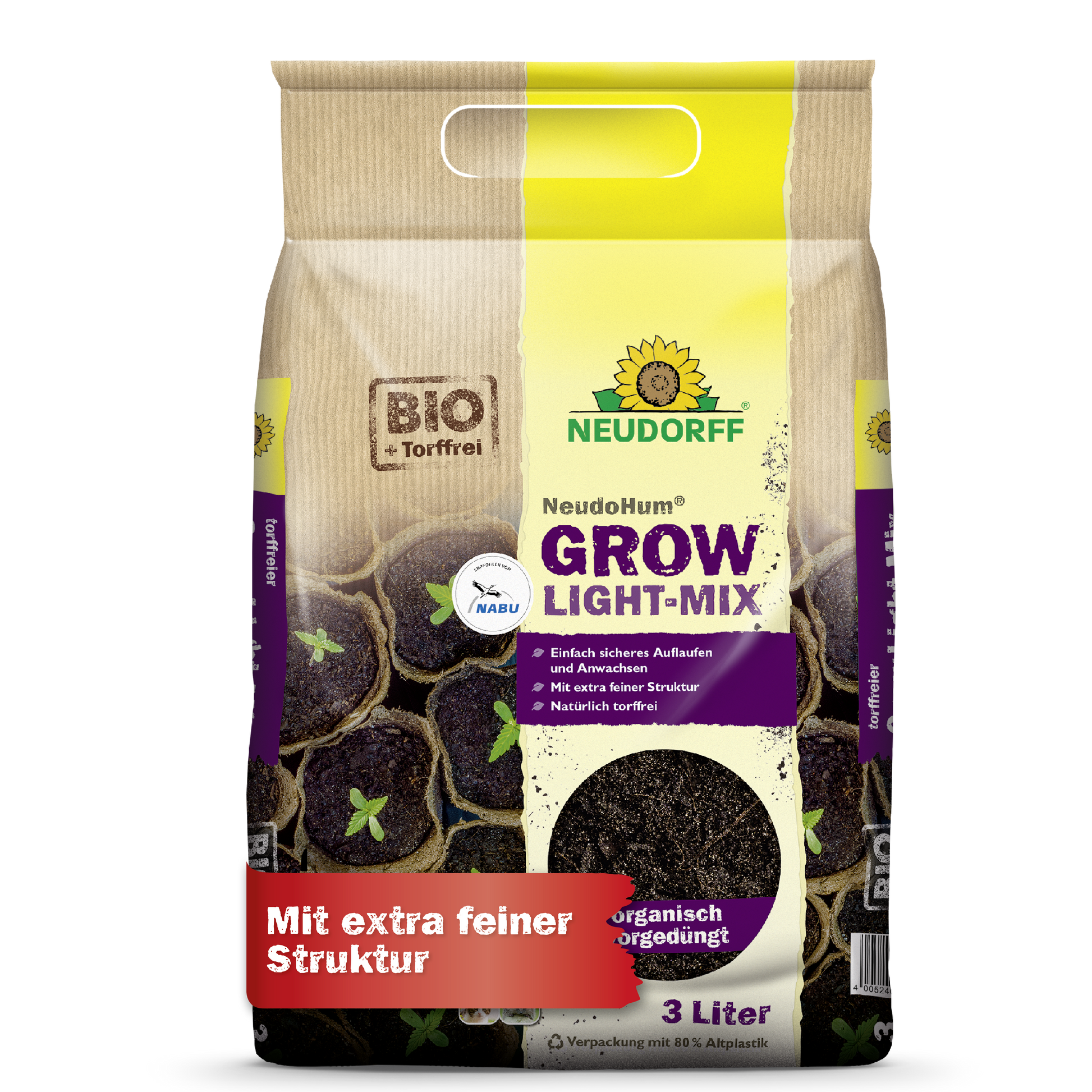 Unbedenklich für Mensch und Tier und verpackt in 80 % Recyclingplastik, verbindet die NeudoHum® Grow Light-Mix Erde Nachhaltigkeit, Qualität und Zuverlässigkeit – für eine sichere Anzucht, kräftige Pflanzen und hohe Erträge.