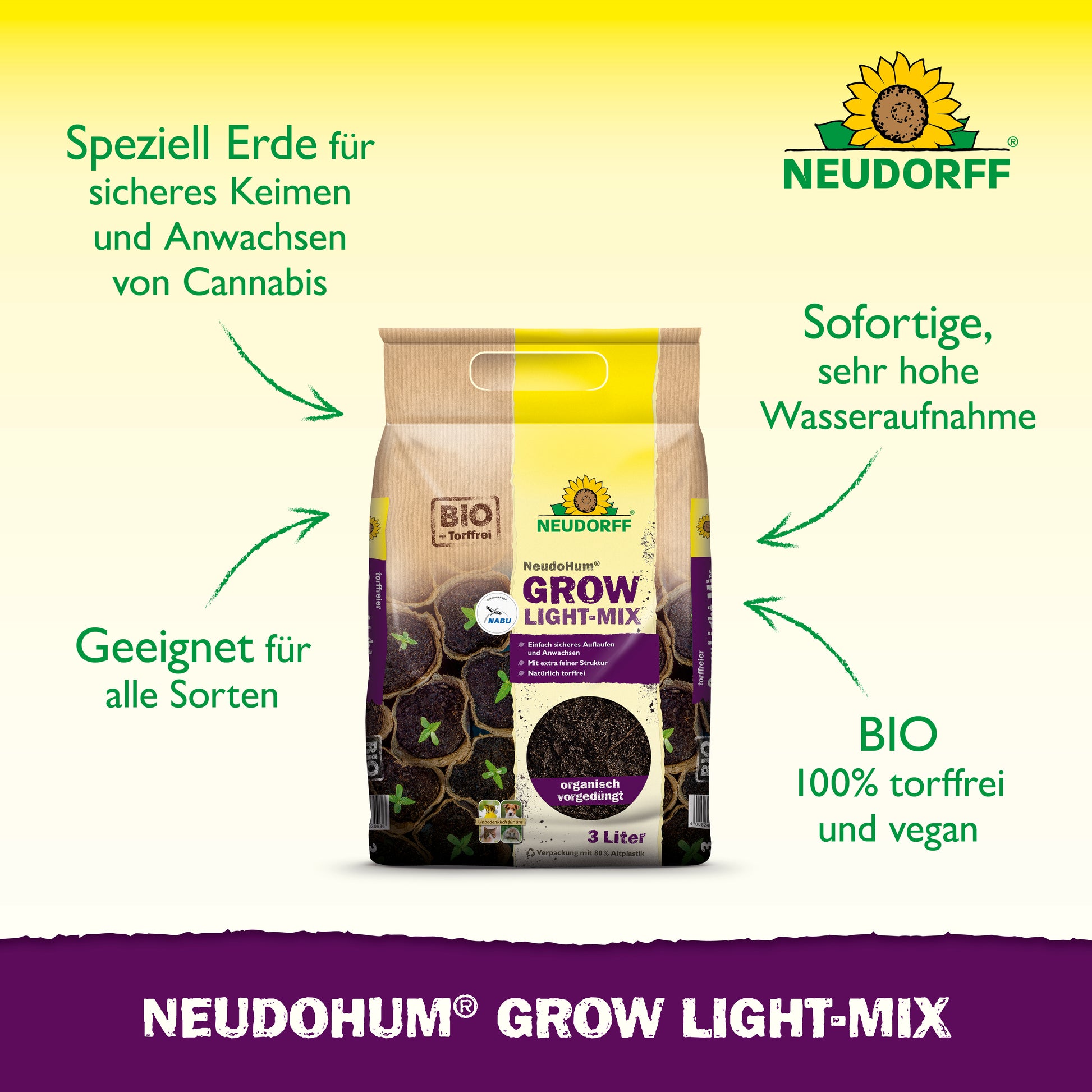 Die NeudoHum® Grow Light-Mix Erde ist das Spezialsubstrat für die erfolgreiche Aussaat und Anzucht von Cannabis. Die torffreie und vegane Erde besteht aus 100 % natürlichen Rohstoffen und wird vom NABU empfohlen. Ihre extra feine Struktur schafft die idealen Voraussetzungen für ein sicheres Keimen, gleichmäßiges Auflaufen und kräftiges Wurzelwachstum – sowohl im Indoor- als auch im Outdoor-Bereich.