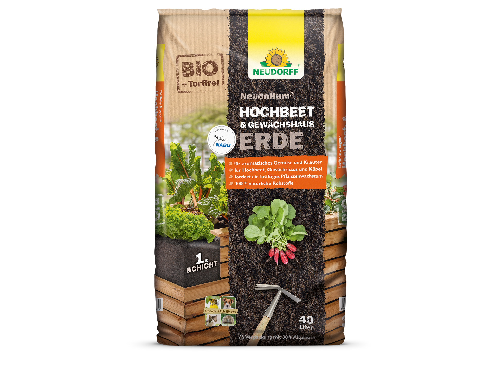 NeudoHum Hochbeet- & GewächshausErde bietet das, was Ihre Pflanzen brauchen! Die Erde enthält neben anderen Nährstoffen einen hohen Gehalt an natürlichem Kalium für aromatische und widerstandsfähige Tomaten, Zucchini, Paprika, Kürbis, Gurken und andere Gemüsepflanzen. NeudoHum Hochbeet- & GewächshausErde eignet sich für alle Pflanzen im Hochbeet, Gewächshaus und Kübel. Das Pflanzsubstrat fördert ein kräftiges und gesundes Pflanzen- und Wurzelwachstum durch die Zufuhr von organischem Material. Die lockere Struktur der Erde verhindert Staunässe, sorgt für eine gleichmäßige Wasserverteilung und bewirkt gleichzeitig eine gute Durchlüftung. Die schnell abtrocknende Oberfläche verhindert Trauermücken- und Pilzbefall.