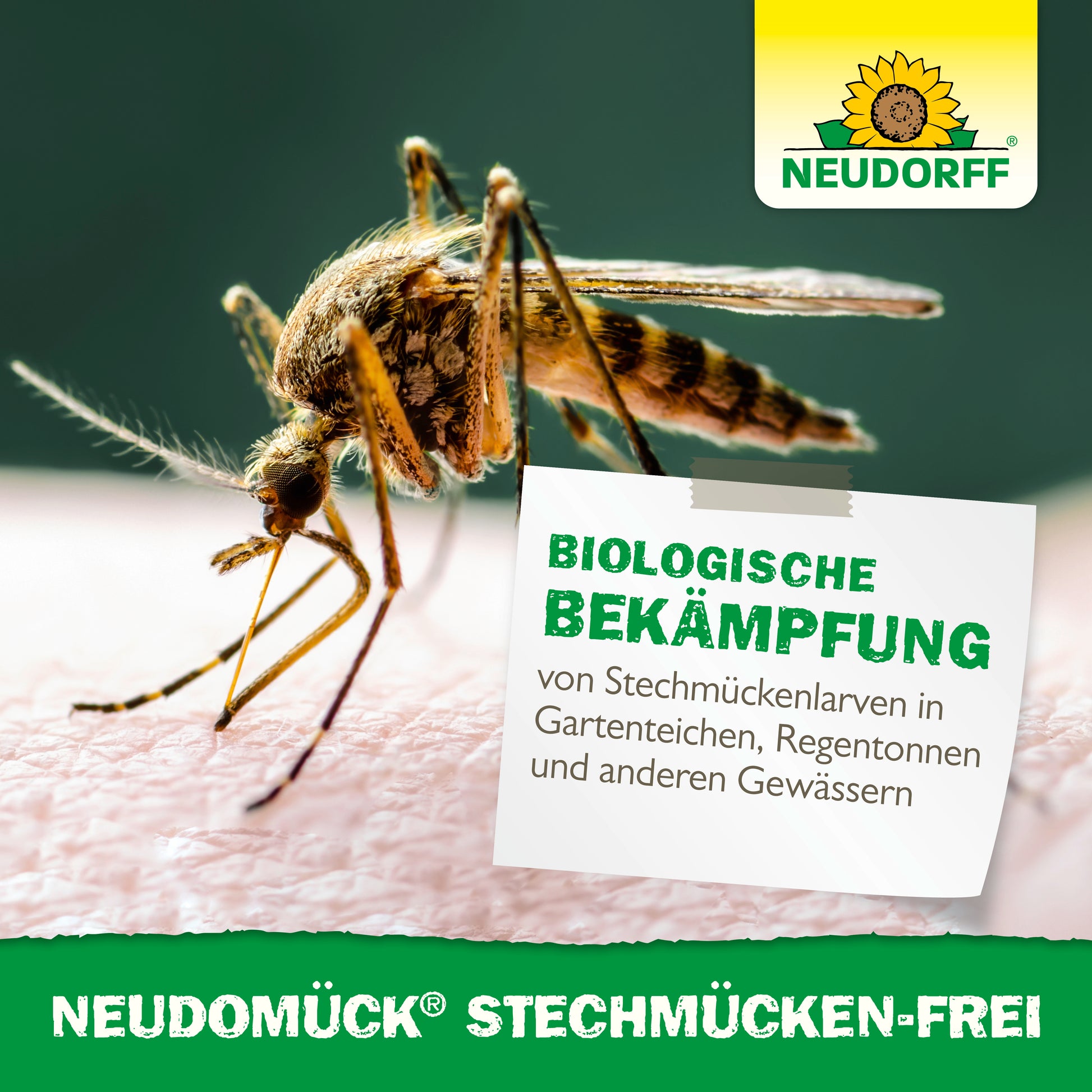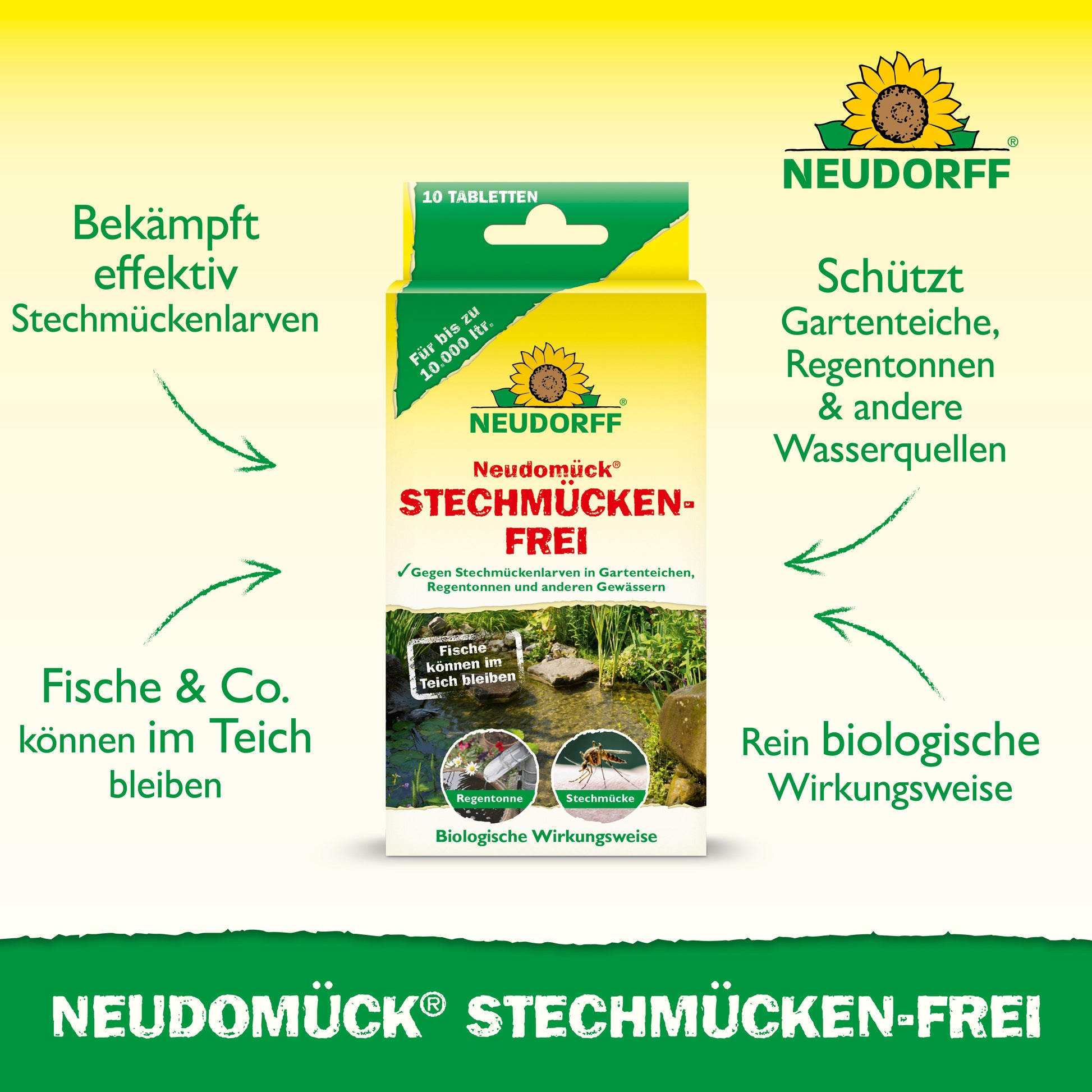 Neudomück Stechmücken-Frei bekämpft den „Nachwuchs“ (Larven) von Stechmücken. Stechmücken vermehren sich in stehendem Wasser wie z.B. in Gartenteichen, Tümpeln und auch Regentonnen. Dort entwickeln sich unter der Wasseroberfläche die Larven der Mücken, die bis zu 6 mm groß sind. Neudomück Stechmücken-Frei wirkt ganz biologisch durch Mikroorganismen. Die Larven sterben dadurch ab, sodass die Belästigung durch Mücken deutlich abnimmt. Fische, Pflanzen, Libellen, Frösche und andere Wasserorganismen werden durch Neudomück Stechmücken-Frei nicht beeinträchtigt und können auch während der Anwendung im Teich bleiben. Nach der Verwendung des Produkts in der Regentonne können Sie das Wasser weiter zum Gießen nutzen. Die Wirkungsdauer von Neudomück Stechmücken-Frei hält bis zu 4 Wochen an.