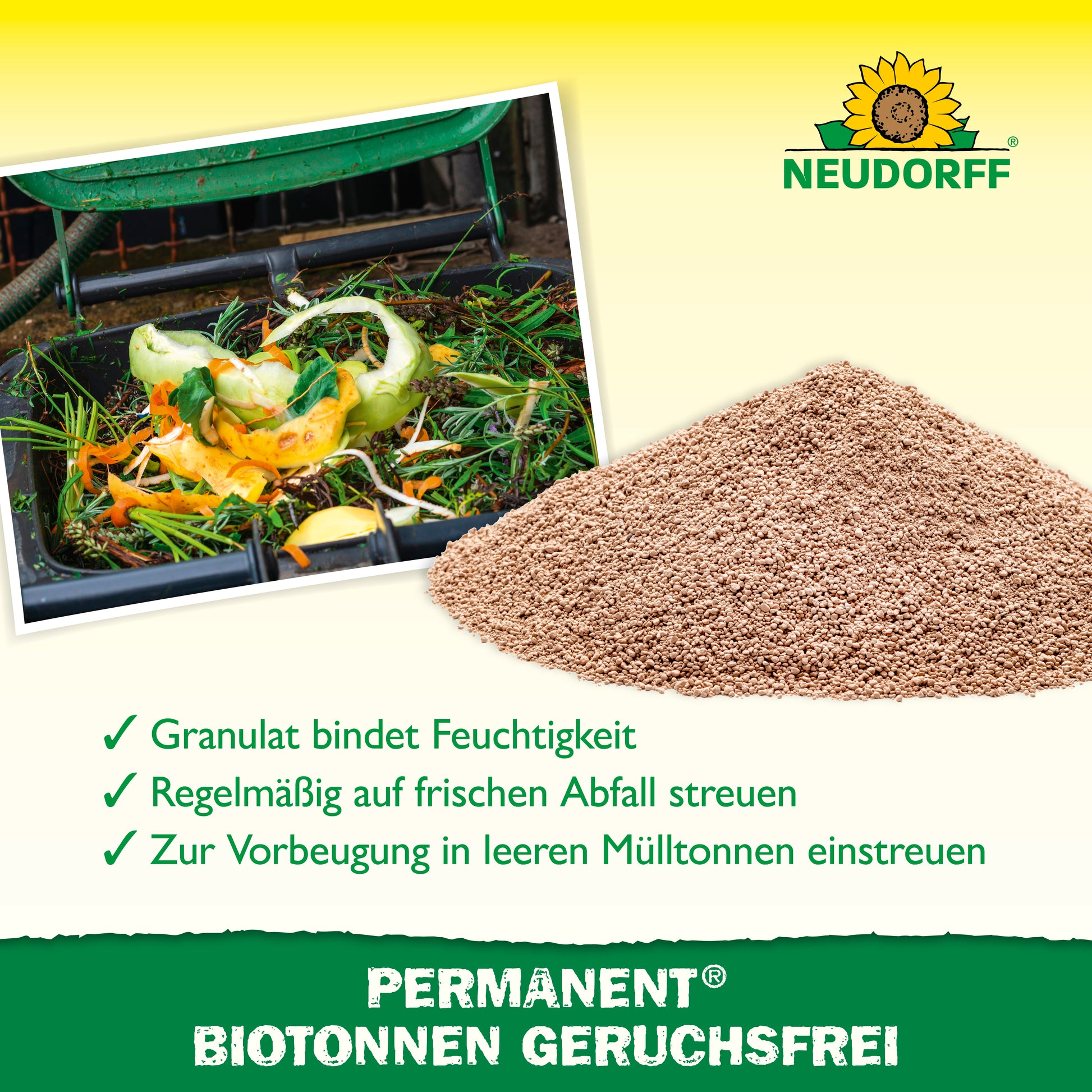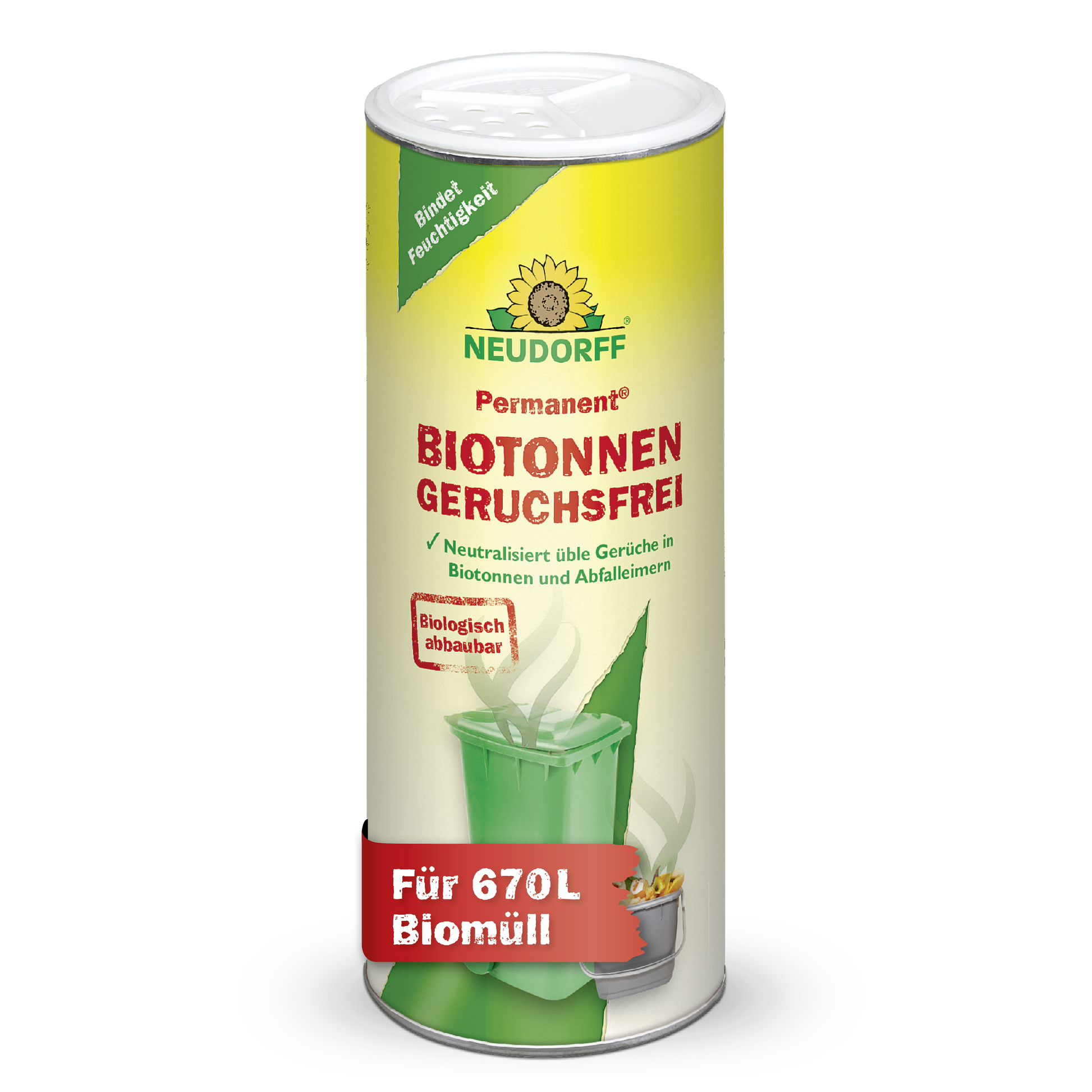 Permanent Biotonnen GeruchsFrei ist ein biologisch abbaubares Granulat mit ätherischen Ölen gegen üble Gerüche in Biotonnen, Abfalleimern, Müllsäcken und Kompostern. Das Granulat bindet Feuchtigkeit und reduziert so Schimmel- und Fäulnisbildung. Dadurch entstehen weniger Geruchsstoffe und Faulgase, die Fliegen und anderes Ungeziefer anlocken können. Permanent Biotonnen GeruchsFrei reicht für ca. 670 l Biomüll.