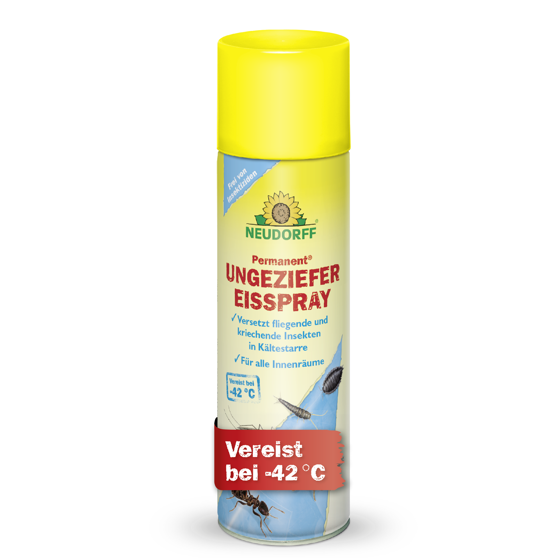 Mit Permanent Ungeziefer EisSpray versetzen Sie Ameisen, Mücken, Silberfischchen, Asseln und Fliegen in eine Kältestarre. Das EisSpray enthält Gas, das beim Sprühen sehr schnell verdampft. Der Sprühstrahl kühlt sich auf -42 °C ab. Getroffenes Ungeziefer erstarrt durch den plötzlichen Kälteeffekt und kann einfach aus dem Haus gebracht werden. So kommen keine insektiziden Wirkstoffe zum Einsatz. Beläge aus Eiskristallen auf Oberflächen verschwinden nach kurzer Zeit wieder. Der Inhalt reicht für bis zu 60 Anwendungen.