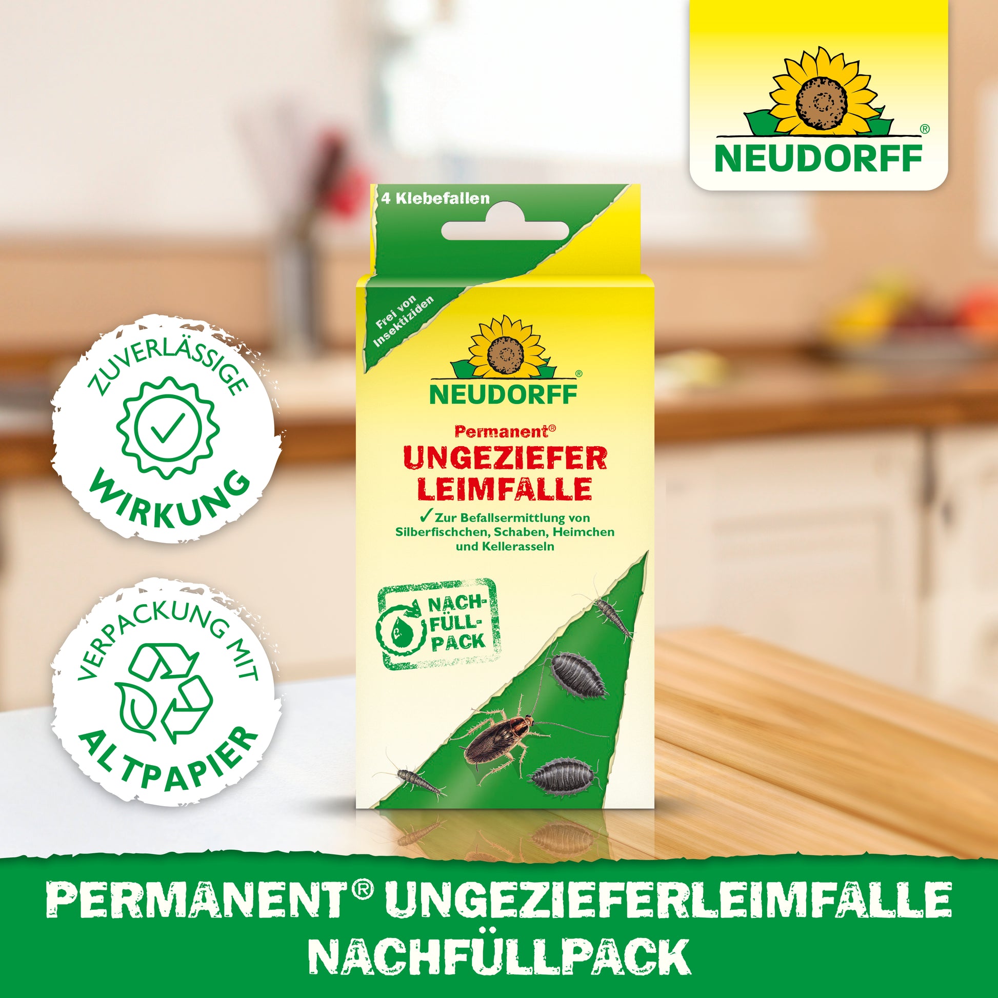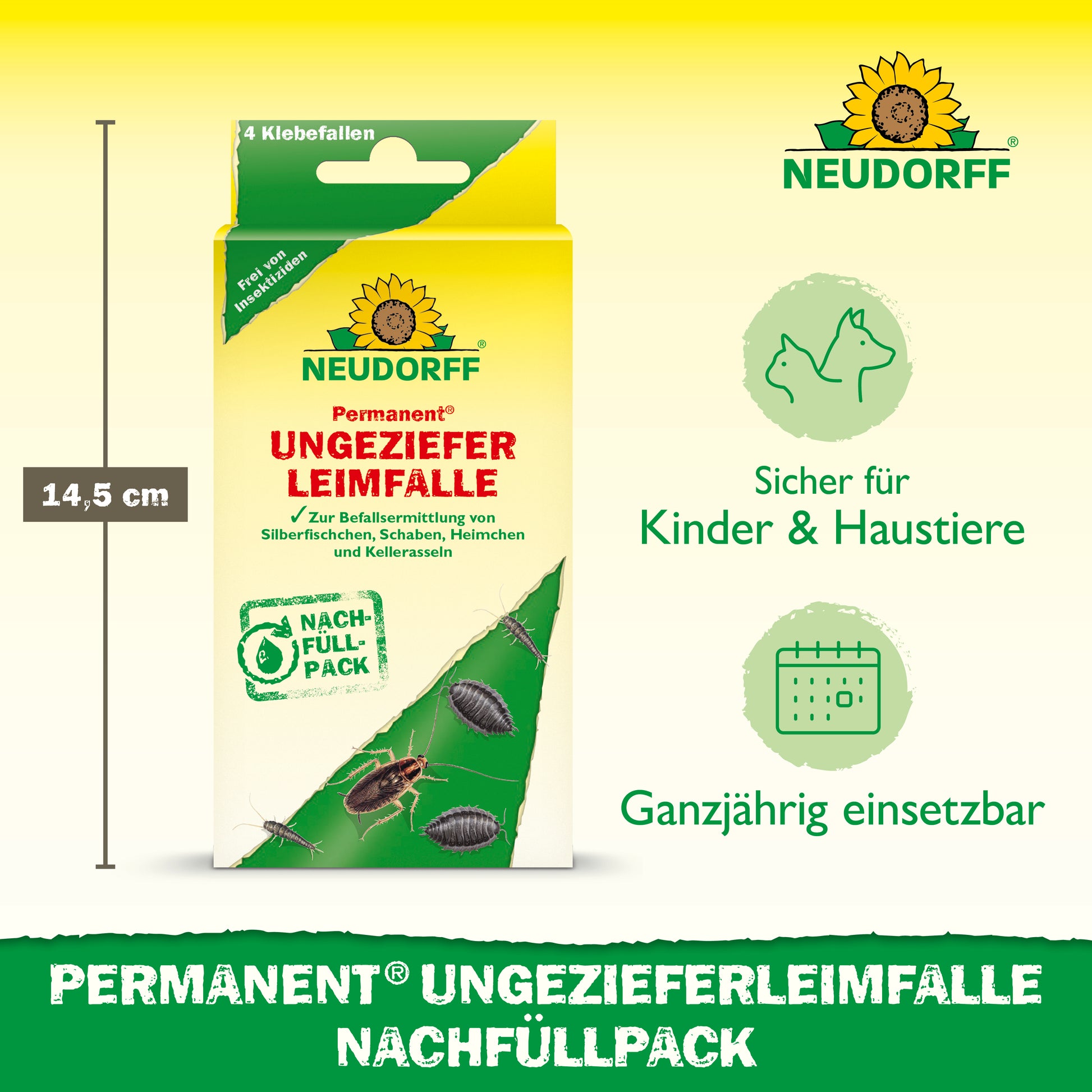 Permanent UngezieferLeimFalle Nachfüllpack mit vier insektizidfreien Klebeböden zur Nachbestückung des Fallenkörpers.Tauschen Sie die Klebeböden nach 8 Wochen oder wenn sie mit Insekten besetzt sind, aus. Neue Klebeböden so lange einsetzen, bis Sie kein Ungeziefer mehr beobachten.