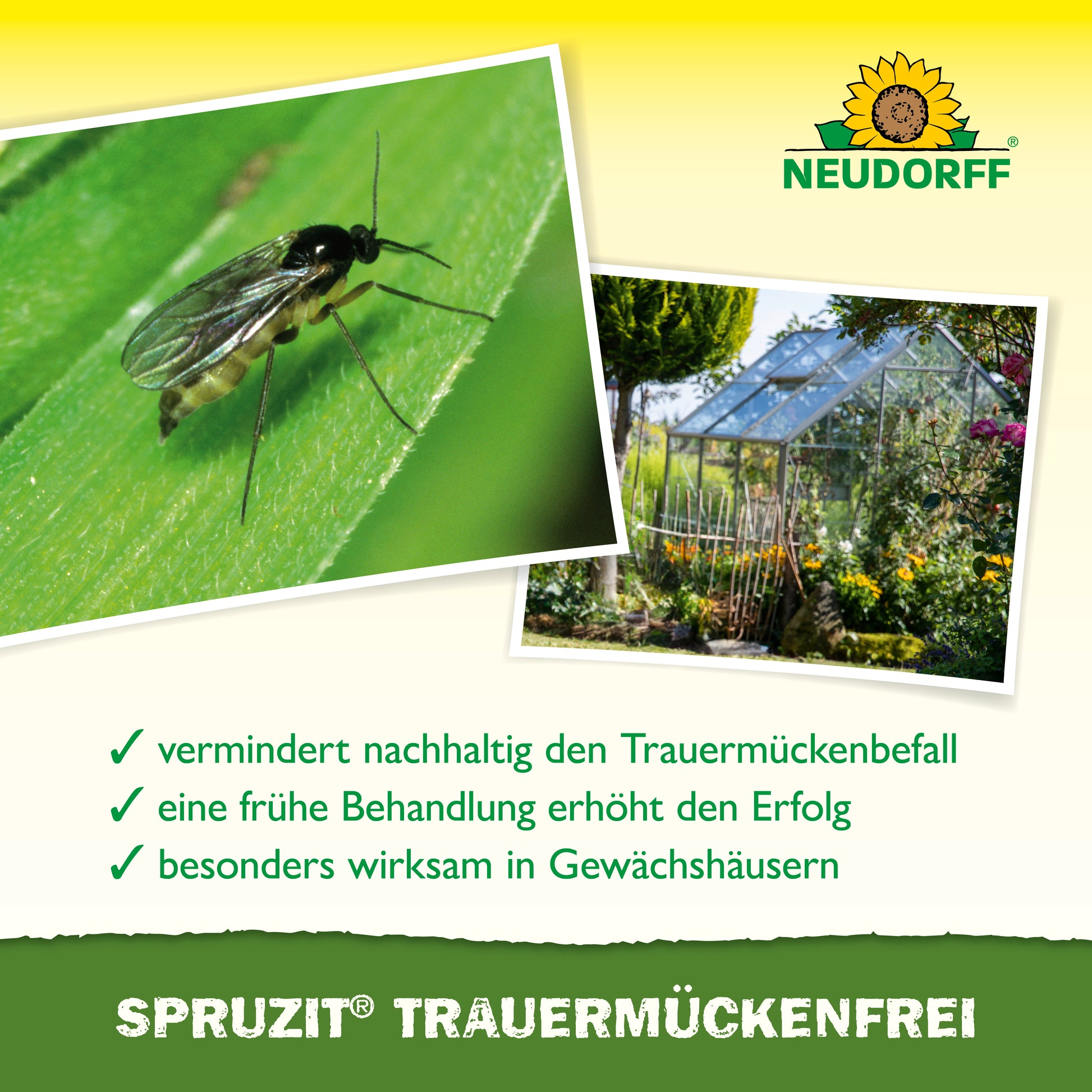 Trauermücken effektiv, schnell und wirksam bekämpfen: Spruzit TrauermückenFrei ist ein wirksames Gießmittel zur Bekämpfung von Trauermücken (Schwarze Fliege) im Gewächshaus. bzw. unter Glas. Der natürliche Wirkstoff Azadirachtin (Neem) wirkt auf die Wachstumsregulatoren der Larven und verhindert eine Weiterentwicklung zum ausgewachsenen Insekt. So wird das Auftreten von neuen erwachsenen Trauermücken nachhaltig vermindert.
