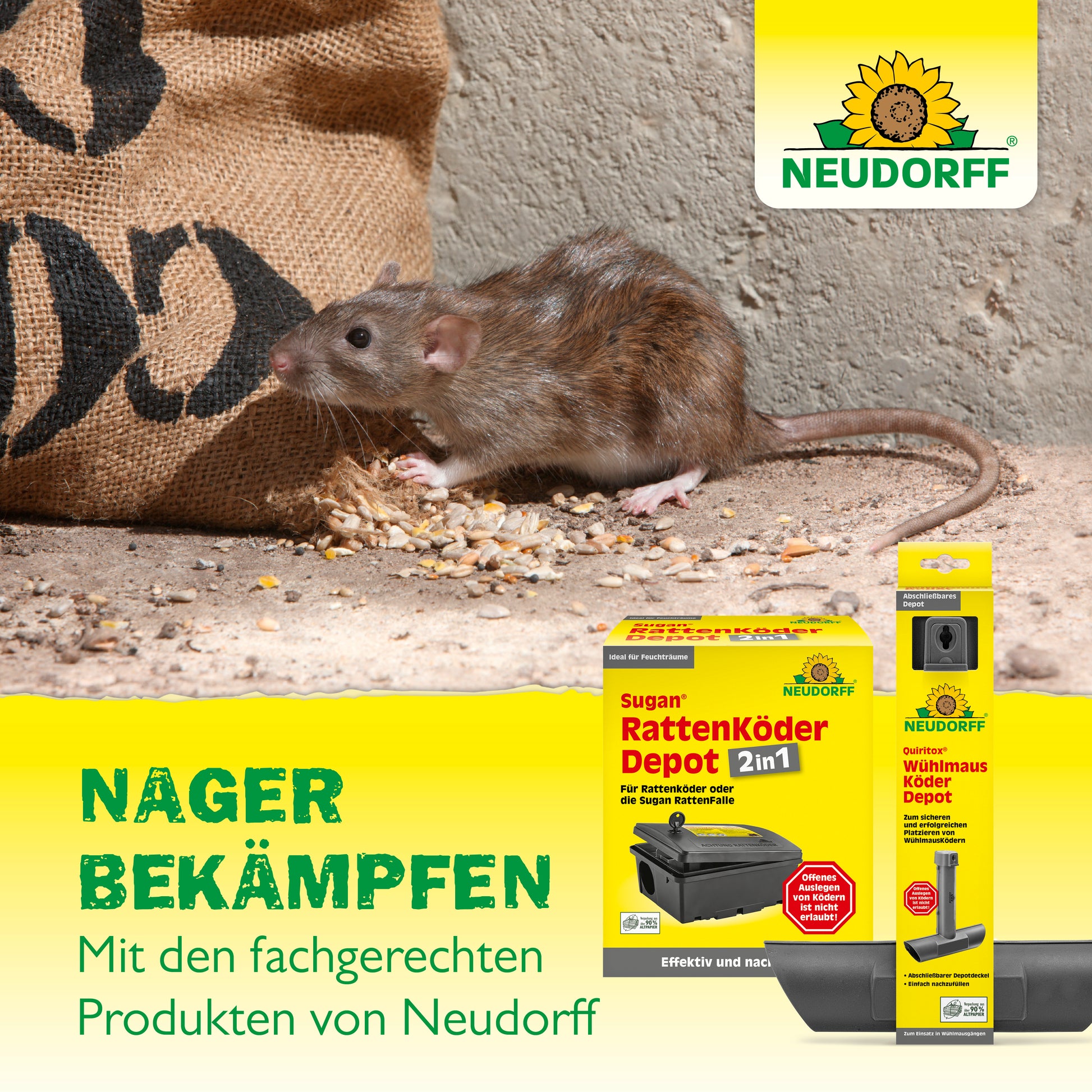 Die Sugan MäuseKöder Station mit Monitoringköder ist eine sichere und hygienische All-in-One-Lösung zur Ermittlung und Bekämpfung von Mäusebefall. Das robuste Depot aus Kunststoff und Stahl ist mit einer effizienten Schlagfalle und einem attraktiven Duftköder ausgestattet, der Mäuse zuverlässig anlockt, ohne toxisch zu wirken. So lässt sich ein Befall bis zu drei Monate sicher feststellen – ganz ohne Gift, Schimmelbildung oder Allergene.
