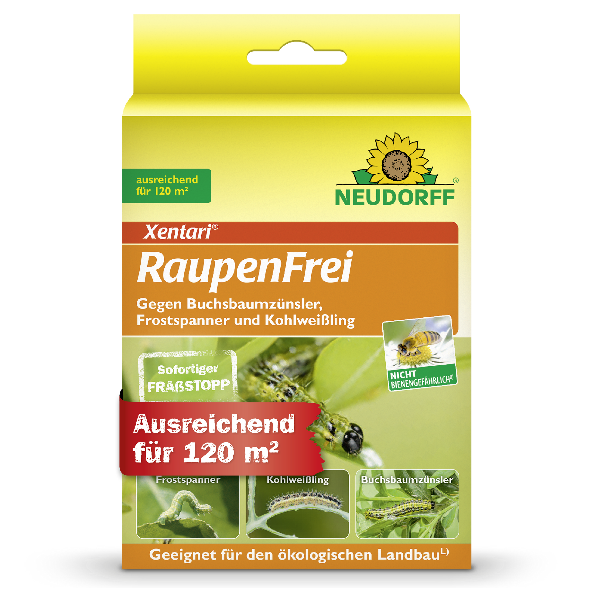 Ein frühzeitiger Einsatz von Xentari® RaupenFrei – idealerweise beim ersten Auftreten der Raupen oder beim Schlupf der Junglarven – erhöht die Bekämpfungssicherheit deutlich und hilft, starken Blattfraß und Kahlfraß, insbesondere an Buchsbäumen, zu verhindern. Das Mittel eignet sich für den Einsatz an Buchsbäumen, Kohlgemüse sowie Kernobst und ist eine bewährte Lösung für den umweltbewussten Pflanzenschutz im Haus- und Kleingarten..